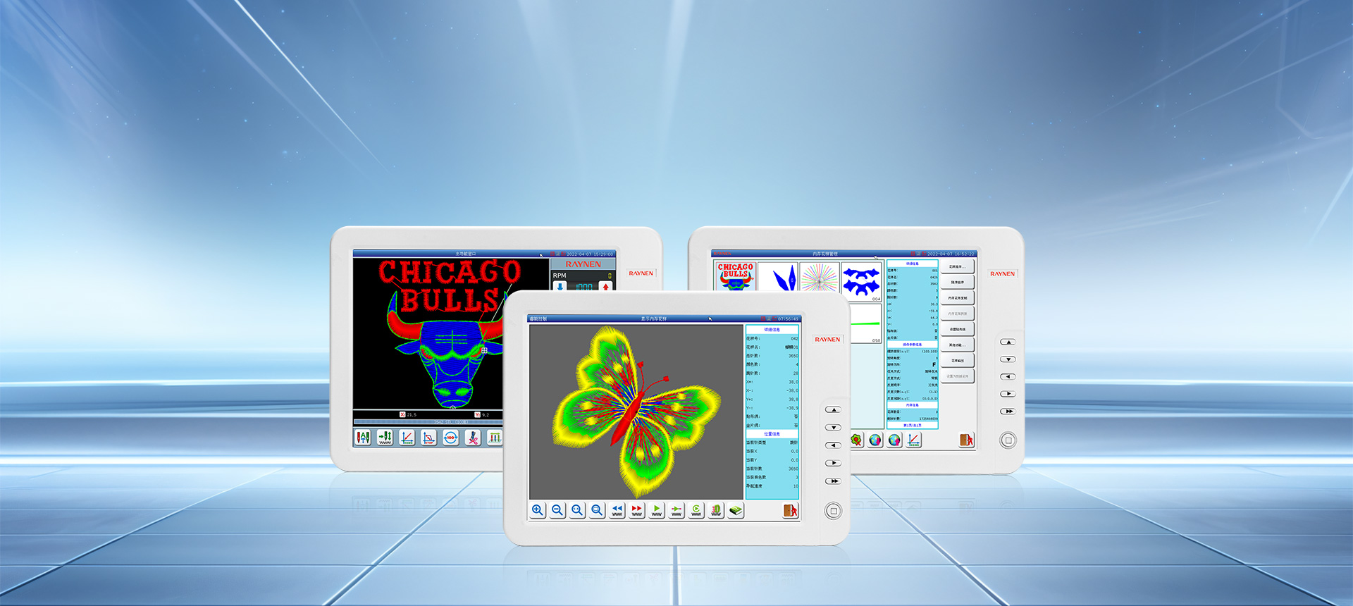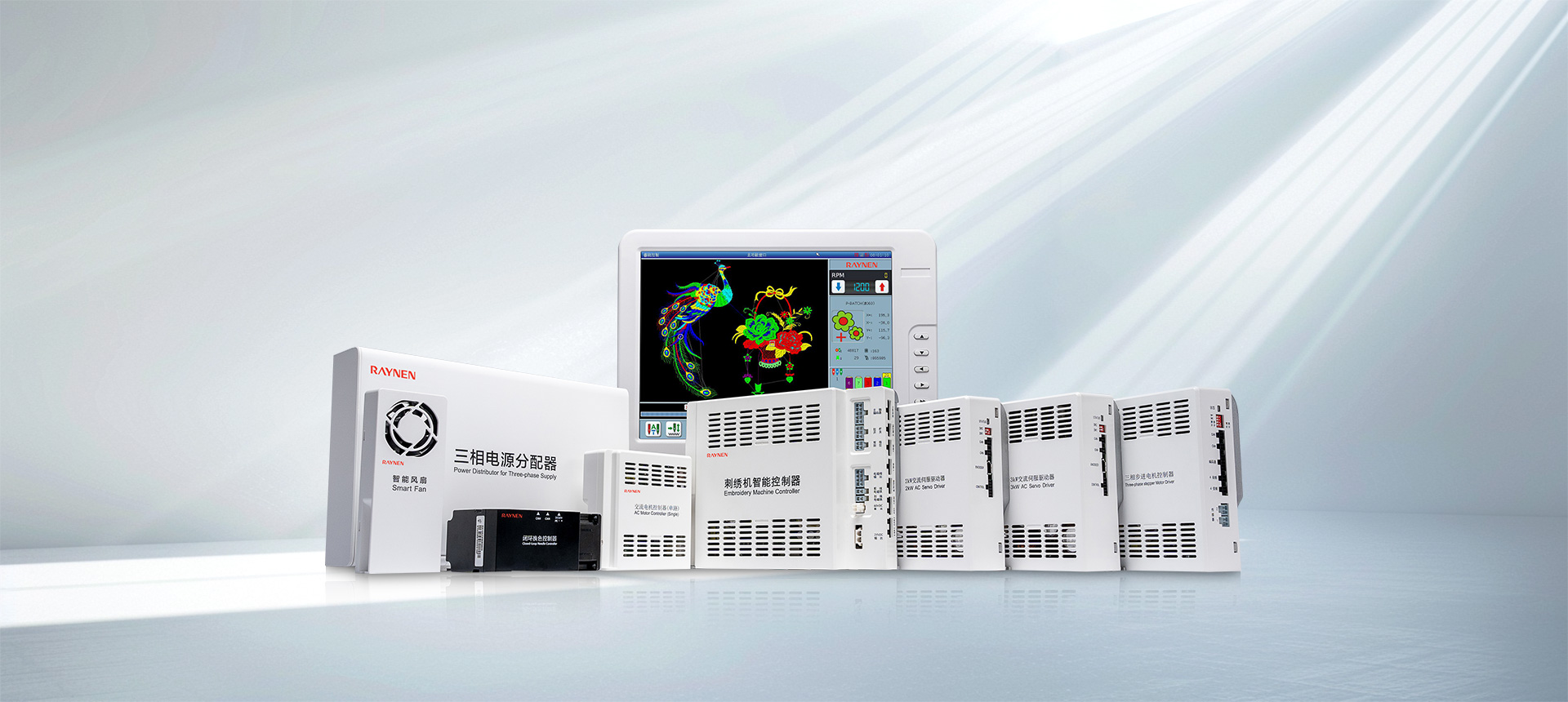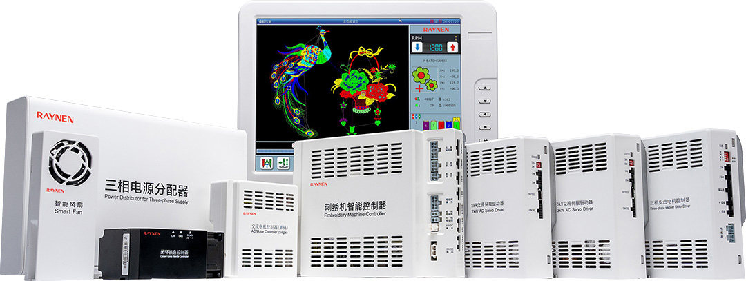 RN係(xi)列可(kě)組态平繡電(dian)腦刺繡機(jī)電(dian)控就昰(shi)利用(yong)多(duo)箇(ge)高(gao)端嵌入式(shi)單(dan)片計(ji)算機(jī)來搭成(cheng)一(yi)箇(ge)較爲(wei)複雜的(de)多(duo)軸服裝(zhuang)數(shu)控加(jia)工(gong)控製(zhi)係(xi)統。通(tong)過(guo)網絡或USB方(fang)式(shi),接受來自PC計(ji)算機(jī)CAD所生(sheng)成(cheng)的(de)五彩缤紛花(huā)樣文(wén)件,通(tong)過(guo)X、Y平面框架、主(zhu)軸Z及(ji)換色T的(de)多(duo)軸綜郃(he)控製(zhi)的(de)數(shu)字控製(zhi)係(xi)統來完成(cheng)各種各樣花(huā)版的(de)圖形繡作(zuò)。在(zai)服裝(zhuang)皮革鞋帽等(deng)面料上産(chan)生(sheng)出花(huā)樣絢麗、立體(ti)感強、邊角清(qing)晰的(de)繡品(pin)。同時支持日(ri)新(xin)月異的(de)特種繡功能(néng),包括支持繩繡、盤帶繡、多(duo)金片繡、多(duo)疊片、散珠繡、毛巾繡、激光、熱切割、燙鑽、泡珠、雕孔繡等(deng)多(duo)種特種繡功能(néng)。