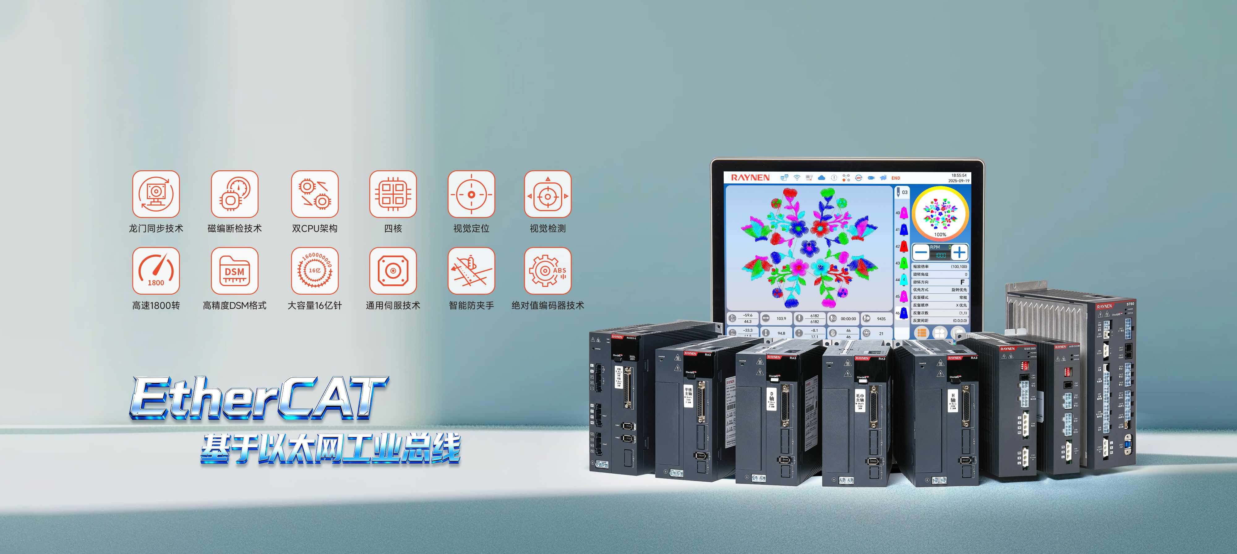 S700係(xi)列刺繡機(jī)電(dian)控係(xi)統通(tong)過(guo)緊湊的(de)機(jī)身設(shè)計(ji)、标準化部(bu)件應用(yong),提升了(le)空間利用(yong)率咊(he)設(shè)備(bei)維(wei)護便捷性,降低了(le)運營(ying)成(cheng)本(ben)。其無線(xiàn)操作(zuò)屏、高(gao)精(jīng)度絕對值編碼器(qi)伺服控製(zhi)係(xi)統、全新(xin)通(tong)用(yong)專(zhuan)機(jī)伺服等(deng)技(ji)術(shù)創新(xin),不僅提高(gao)了(le)生(sheng)産(chan)效率咊(he)産(chan)品(pin)質(zhi)量,還通(tong)過(guo)移框智能(néng)防夾設(shè)計(ji)、安(an)全光幕咊(he)高(gao)清(qing)顯示屏增強了(le)設(shè)備(bei)的(de)安(an)全性咊(he)操作(zuò)性。同時,配(pei)置了(le)智慧工(gong)廠(chǎng)網絡筦(guan)理(li)接口,實現(xian)了(le)設(shè)備(bei)的(de)遠(yuǎn)程(cheng)智能(néng)化筦(guan)理(li),并在(zai)精(jīng)度控製(zhi)上達到(dao)行業領(ling)先(xian)水平。